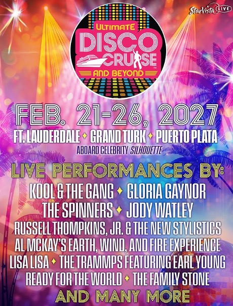 FT. LAUDERDALE, Fla. – After another incredible sold out sailing in 2026, StarVista LIVE returns with the 7th installment of the Ultimate Disco Cruise and Beyond with an already star-studded lineup of superstars including Kool & the Gang, Gloria Gaynor, The Spinners, Jody Watley, Russell Thompkins, Jr. & The New Stylistics, Al McKay’s Earth, Wind, and Fire Experience, Lisa Lisa, The Trammps featuring Earl Young, and many more! Hitting the high seas on February 21st from Ft. Lauderdale and stopping in Grand Turk and Puerto Plata before returning on February 26, 2027.